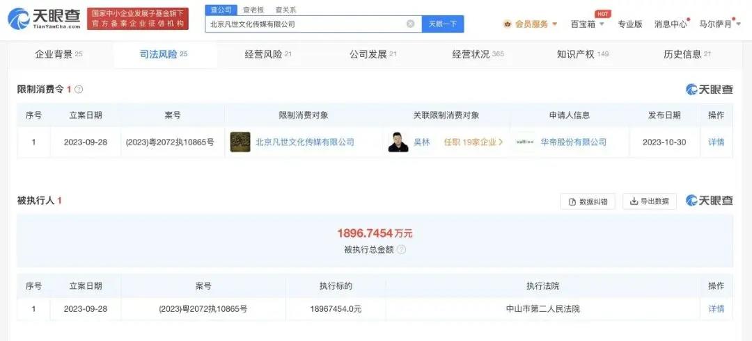 凡世传媒收到限制消费令,主要是此前吴亦凡与华帝股份产生代言纠纷。