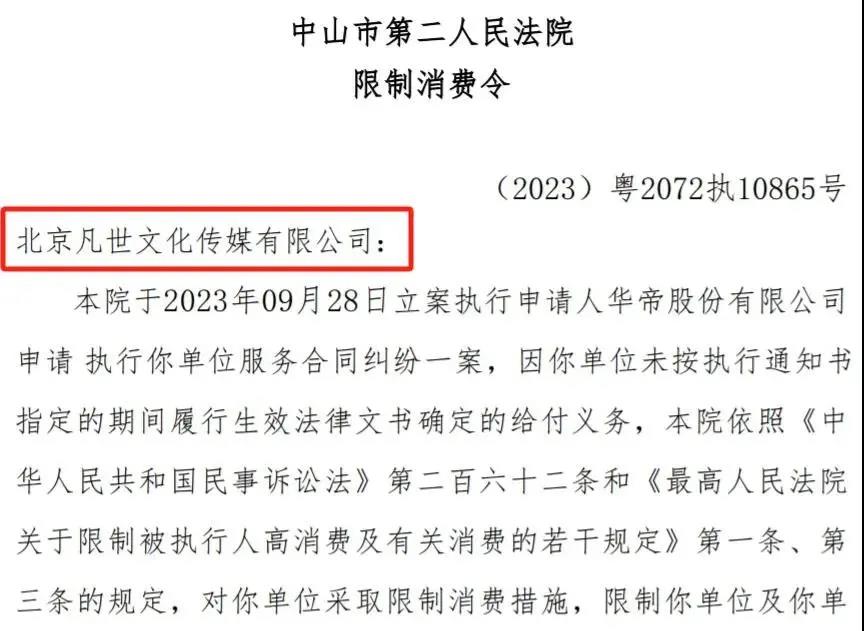 中山市第二人民法院依照《中华人民共和国民事诉讼法》《最高人民法院关于限制被执行人高消费及有关消费的若干规定》相关规定,对凡世传媒采取限制消费措施。