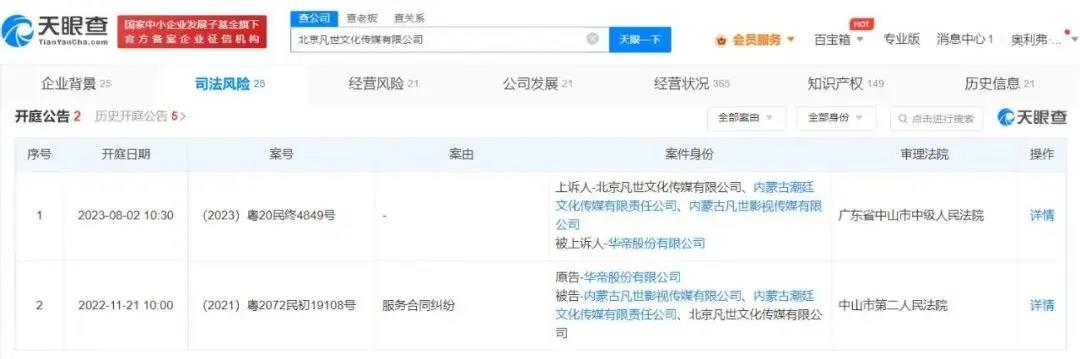 案件流程信息显示,2023年9月底,凡世传媒等相关方因服务合同纠纷诉讼,新增一则被执行人信息,执行标的1896万余元,执行法院为中山市第二人民法院。