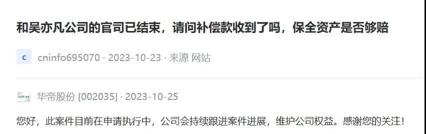 其中,10月25日,华帝股份在互动平台称:“此案件目前在申请执行中,公司会持续跟进案件进展,维护公司权益。”