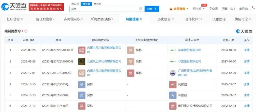 风险信息显示,吴林已多次被限制消费,并涉及两条终本案件信息,未履行金额超6611万元,其名下一处房产也曾被法院进行询价评估。