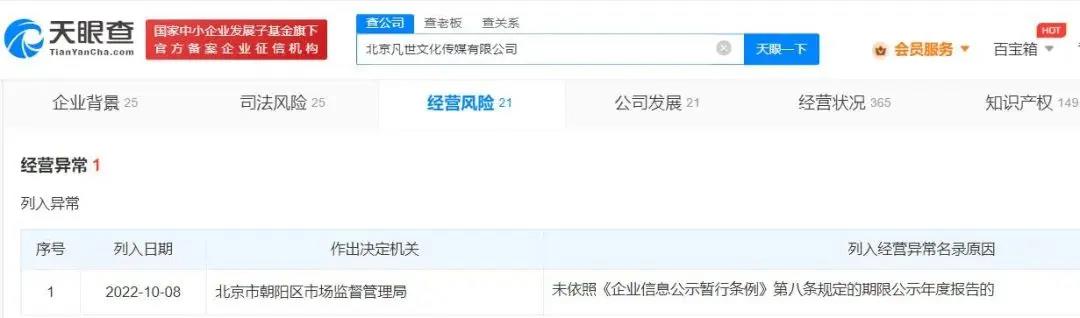 此外,2022年10月,吴亦凡经纪公司凡世传媒因未按规定期限公示年度报告,被列入经营异常名录。