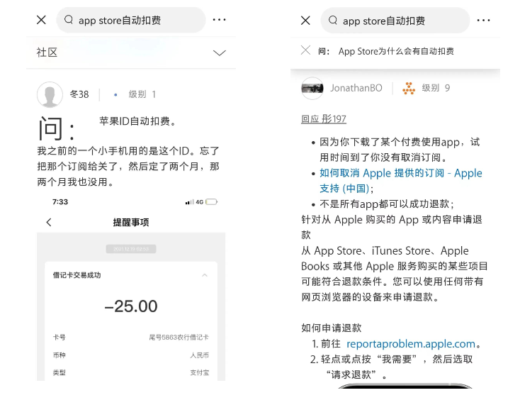张女士将此事件发至朋友圈后,不少人表示自己也有类似经历,莫名被自动扣费了几十元甚至上百元。在苹果官网社区中,记者也看到一些用户关于自动扣费的投诉,其中有两位用户反映,自己使用Apple ID订阅后忘记取消,之后没有使用过所订阅的App,但App Store依旧会自动扣费。苹果官网社区给出的回复是,试用期结束后,用户没有及时取消订阅,App Store依旧会为付费App提供自动扣费服务,直到用户取消,并且不是所有App都能成功退款。