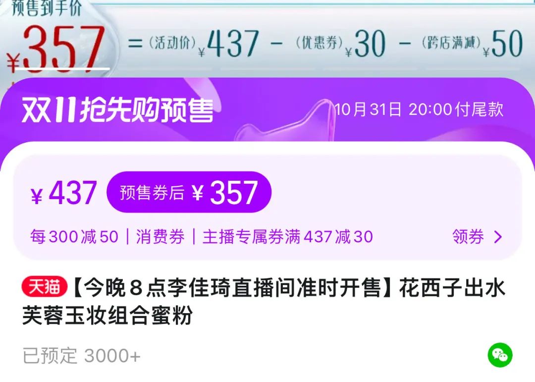 截至24日晚23时30分,花西子售价129元的蜜粉预定已超8万单,149元的粉饼预定超3万单,357元的组合套装预定超3000单,合计超过11万单。