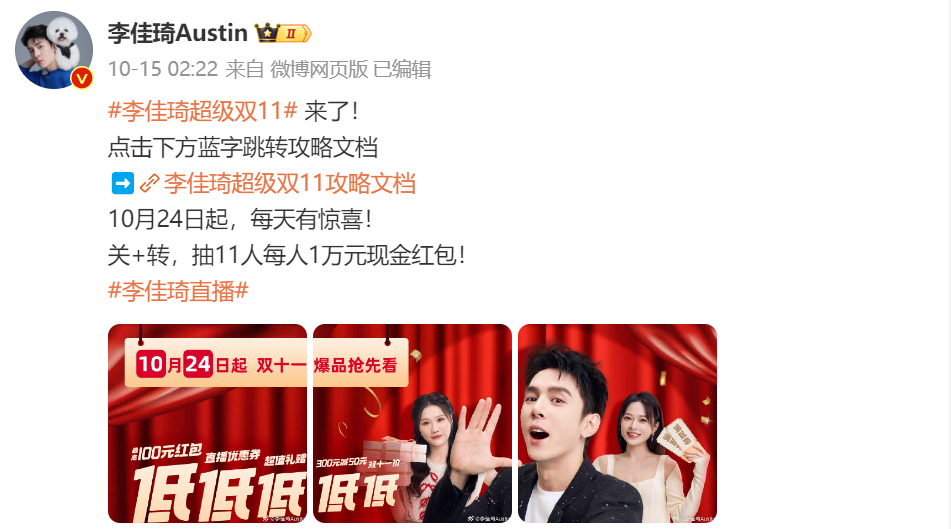 10月15日,李佳琦发文称,将从10月24日开启“李佳琦超级双十一”,并公布出了带货的产品和直播间价格。