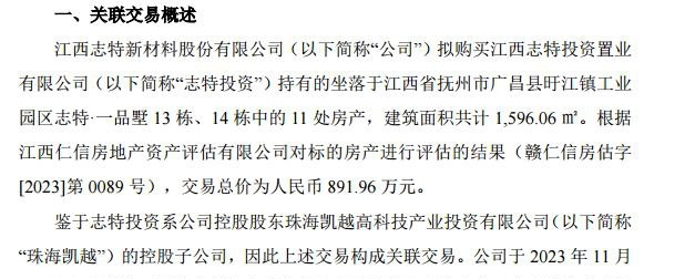 志特新材(300986,股价14.49元,市值35.7亿元)11月10日晚间披露,公司拟购买江西志特投资置业有限公司(以下简称“江西志特”)持有的坐落于江西省抚州市广昌县旴江镇工业园区志特·一品墅13栋、14栋中的11处房产。按照规划,上述房产拟作为员工宿舍使用。