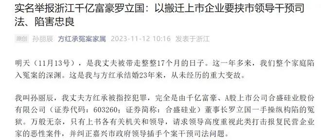 陷害原总经理?搬迁上市企业要挟市领导干预司法?涉嫌污染环境?11月12日,一个名为“方红承冤案家属”的微信号发文,实名举报合盛硅业董事长罗立国。消息一出引发市场关注,交易所的监管函也火速而至,要求公司说明相关情况。