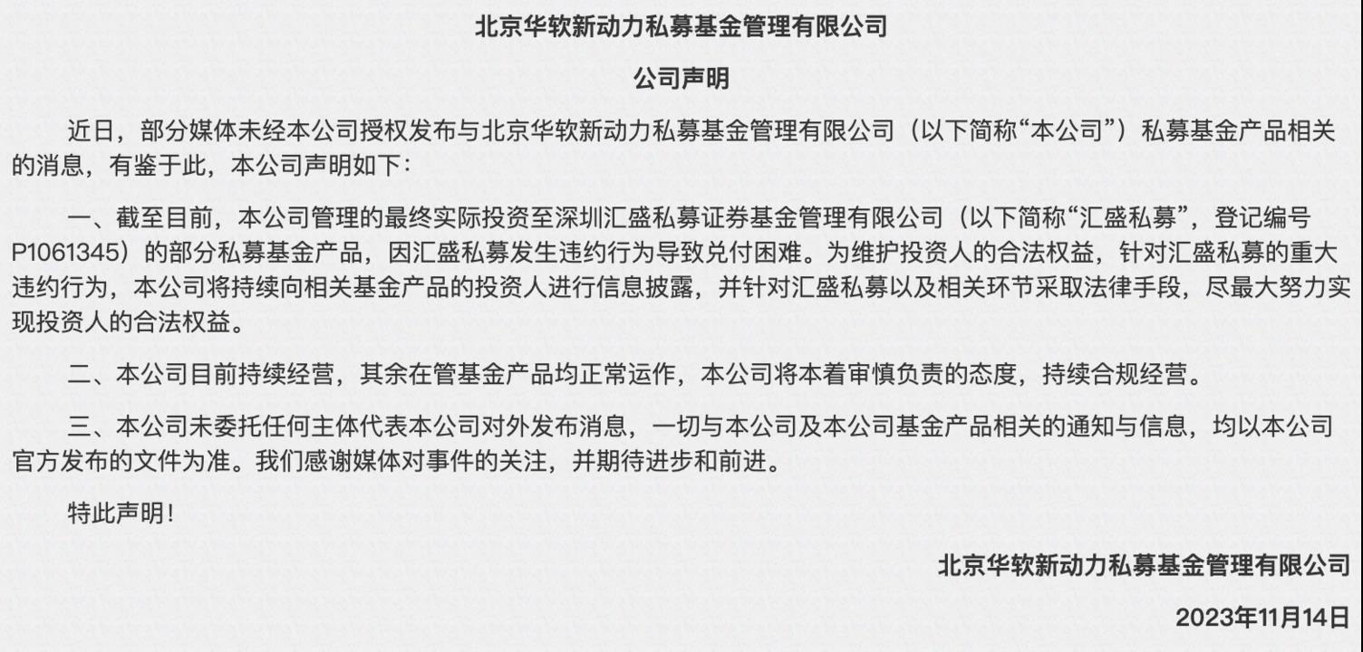 11月14日,北京华软新动力私募基金管理有限公司(下称“华软新动力”)发布私募基金产品相关声明称,截至目前,该公司管理的最终实际投资至深圳汇盛私募证券基金管理有限公司(下称“汇盛私募”,登记编号P1061345)的部分私募基金产品,因汇盛私募发生违约行为导致兑付困难。为维护投资人的合法权益,针对汇盛私募的重大违约行为,该公司将持续向相关基金产品的投资人进行信息披露,并针对汇盛私募以及相关环节采取法律手段,尽最大努力实现投资人的合法权益。