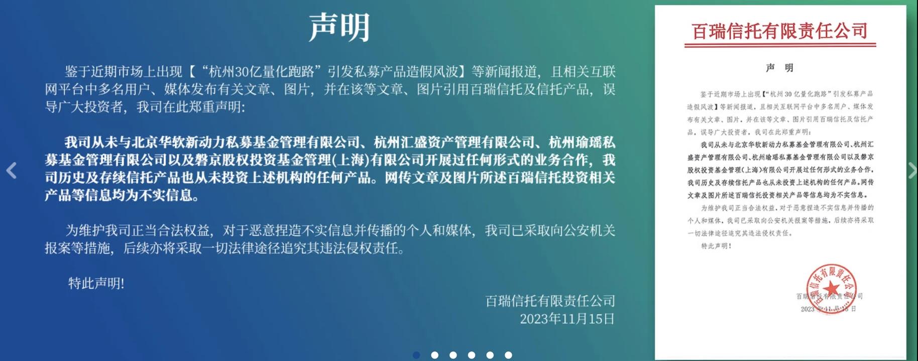 11月15日,百瑞信托发布有关“杭州30亿量化跑路”引发私募产品造假风波的澄清公告,表示公司从未与华软新动力、杭州汇盛资产管理有限公司、杭州瑜瑶私募基金管理有限公司以及磐京股权投资基金管理(上海)有限公司开展过任何形式的业务合作,百瑞信托历史及存续信托产品也从未投资上述机构的任何产品。百瑞信托称,网传文章及图片所述百瑞信托投资相关产品等信息均为不实信息。