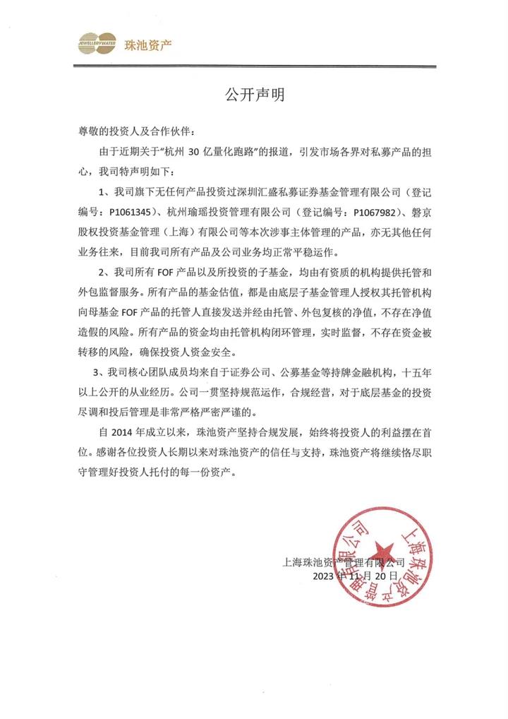 上海珠池资产否认涉“杭州30亿量化跑路”事件:所有产品资金均由托管机构闭环管理