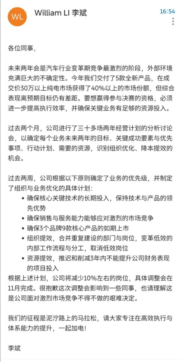 11月3日,蔚来汽车创始人、董事长、CEO李斌发布全员信,称蔚来将要开展涉及组织和资源投入方向的调整。信中提及,公司将减少10%左右的岗位,具体调整在11月完成。