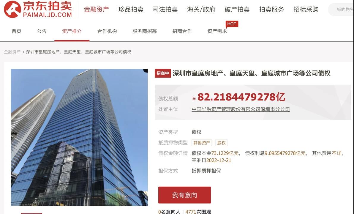 据京东拍卖页面显示,中国华融资产管理股份有限公司深圳市分公司及相关主体,拟对拥有的深圳市皇庭房地产开发有限公司、深圳市皇庭天玺房地产开发有限公司、深圳市皇庭城市广场开发有限公司债权资产在京东拍卖网站上进行公开挂牌处置。