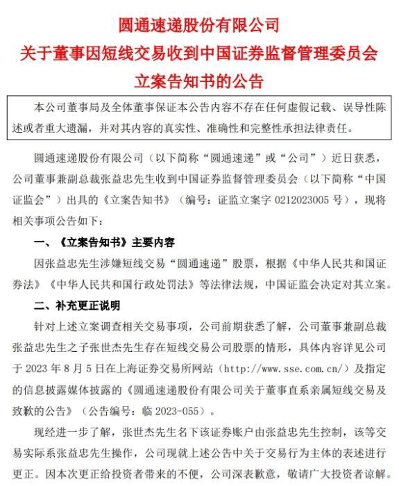 公告还显示,针对上述立案调查相关交易事项,圆通速递前期获悉了解,公司董事兼副总裁张益忠之子张世杰存在短线交易公司股票的情形。现经进一步了解,张世杰名下该证券账户由张益忠控制,该等交易实际系张益忠操作,公司现就上述公告中关于交易行为主体的表述进行更正。