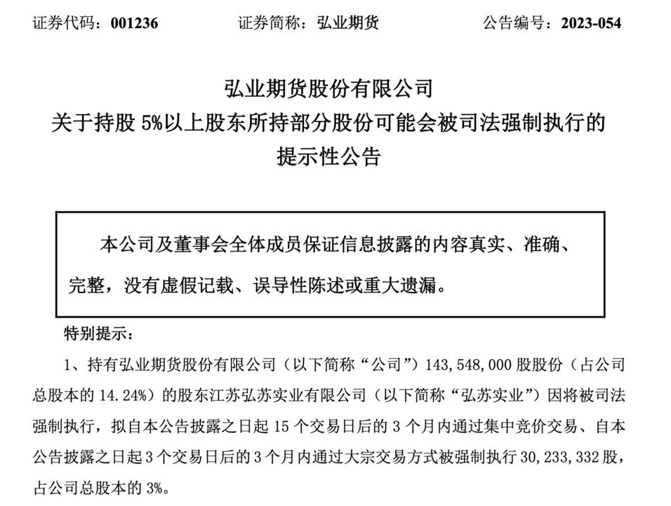 弘业期货表示,近日收到股东江苏弘苏实业有限公司(以下简称“弘苏实业”)的《告知函》,获悉弘苏实业所持公司部分股份将被江西省南昌市中级人民法院司法强制执行处置的情况。