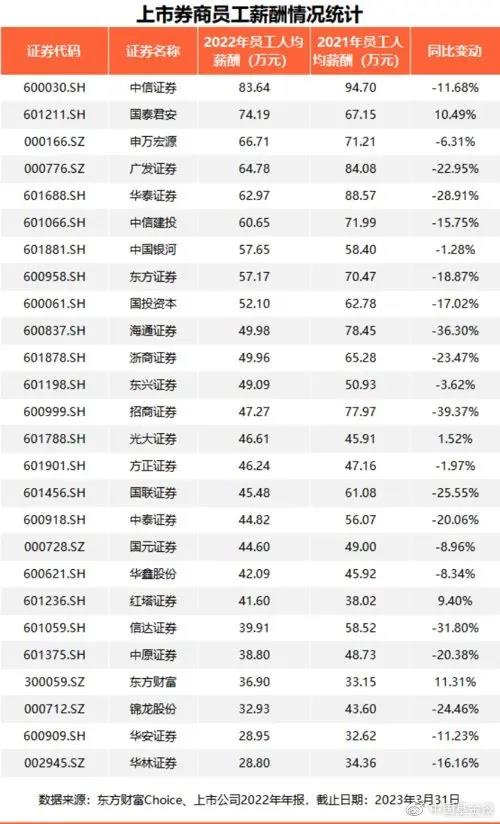 据统计,26家A股上市券商/券商概念股情况来看,仅国泰君安、光大证券、红塔证券、东方财富4家员工薪酬未出现下降,其余22家均有不同程度的降幅。