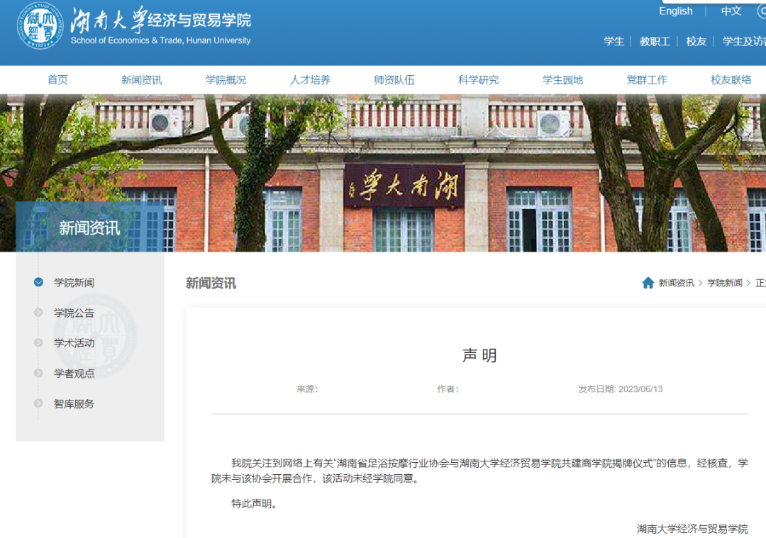 6月13日,湖南大学经济与贸易学院就网传“足浴按摩行业协会与湖南大学共建商学院”一事发布一则声明。