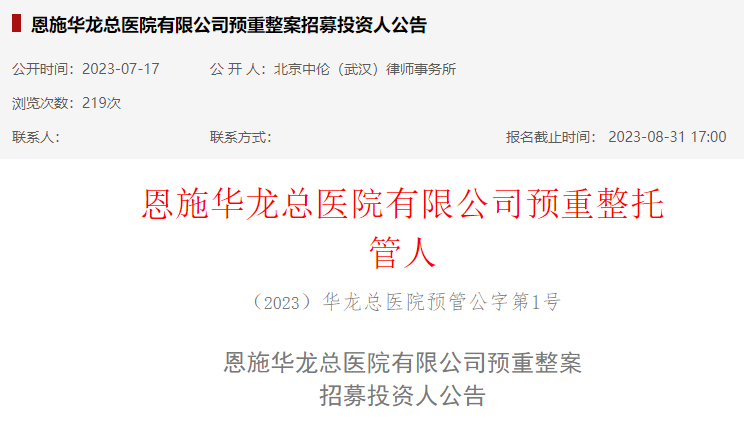 近日,全国企业破产重整案件信息网披露,恩施华龙总医院有限公司(以下简称“恩施华龙总医院”)预重整托管人正面向社会公开招募意向投资人。