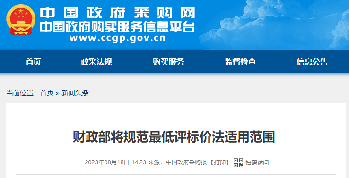 8月18日,中国政府采购网发布《财政部将规范最低评标价法适用范围》一文。其中指出: