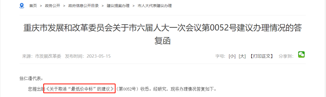 5月15日,重庆市发改委针对市六届人大一次会议翁仁潘代表《关于取消“最低价中标”的建议》作出答复。其中指出,为增加投标人的违法成本,保障招标人合法权益,实施经评审的最低投标价法,需配套执行四项保障制度。