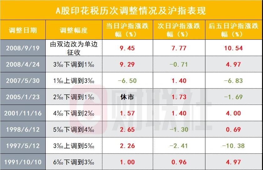 注:A股历史上调整印花税后上证指数的表现