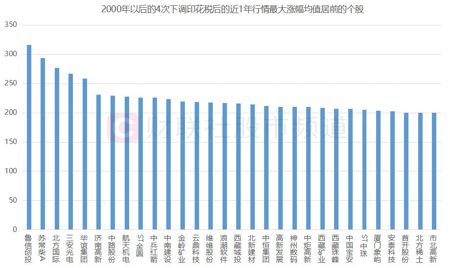 注:2000年以后的4次下调印花税后的近1年行情最大涨幅均值居前的个股