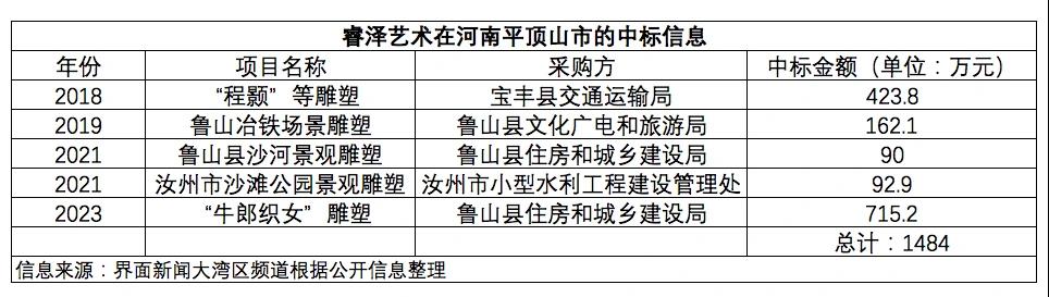 记者查询睿泽艺术历年来的招投标信息发现,除了最新的这次中标,2018年至今,睿泽艺术在河南平顶山市共有5次中标,总金额为1484万元,其中在鲁山县中标3个项目,金额为967.3万元。