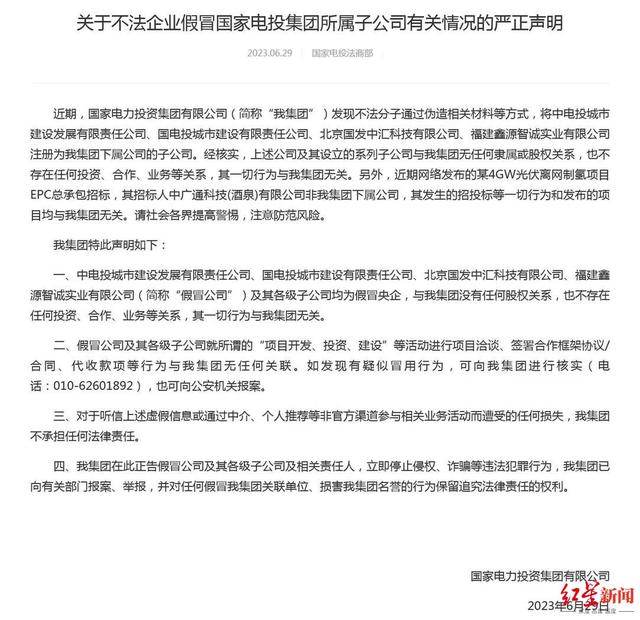 ▲国家电投关于不法企业假冒国家电投集团所属子公司有关情况的严正声明