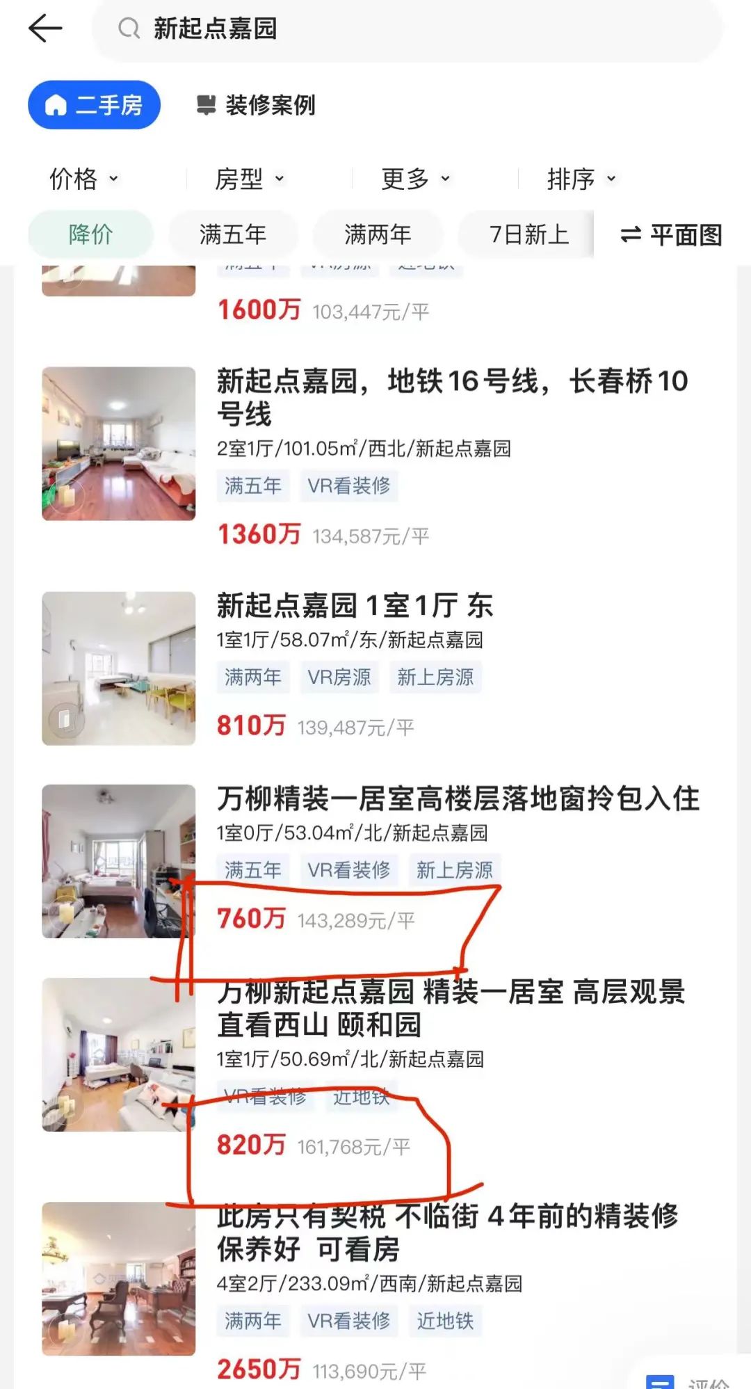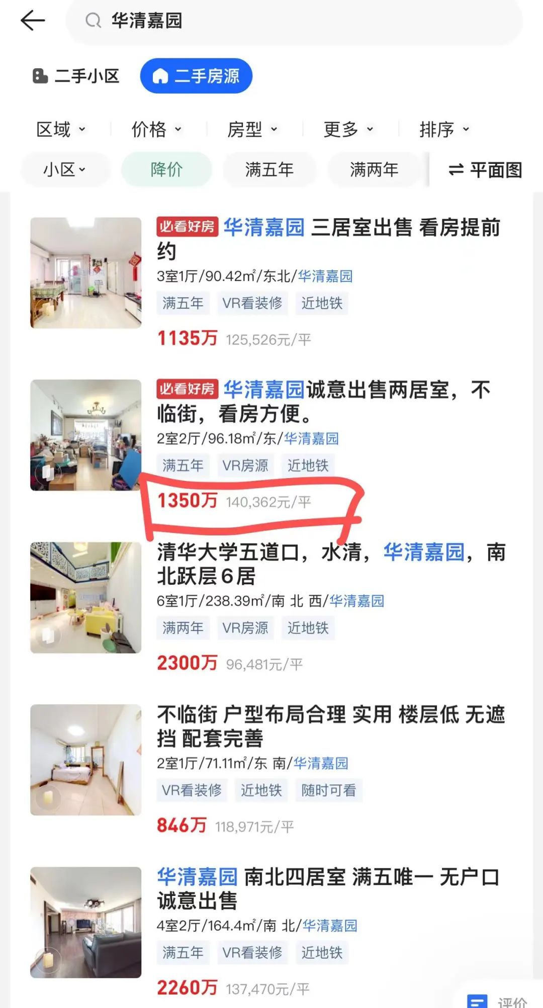 安居客平台也不例外,蜂鸟家园一套46.4平方米的1室1厅1卫房源挂牌总价为800万元,挂牌单价为172414元/平方米;华清嘉园一套149.91平方米的3室2厅2卫房源挂牌总价为2199万元,挂牌单价为146689元/平方米。