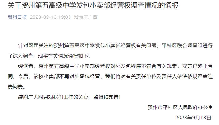 有关部门在调查后表示,贺州第五高级中学小卖部经营权对外发包程序不符合有关规定,双方已终止合同。