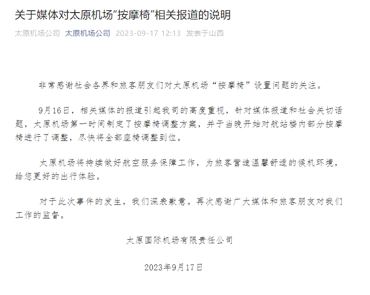 9月17日,“太原机场公司”微信公众号回应按摩椅”设置问题: