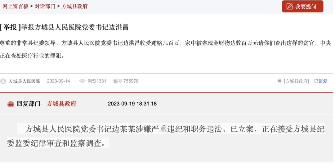9月14日,网友在南阳市长网上留言板留言称,方城县人民医院党委书记边洪昌收受贿赂,家中被盗现金财物达数百万元,引发关注。9月19日,河南省南阳市方城县政府回复称,被举报人边洪昌涉嫌严重违纪和职务违法,已立案。南阳市纪律检查委员会官方公众号通报称,目前,边洪昌正在接受方城县纪委监委纪律审查和监察调查。