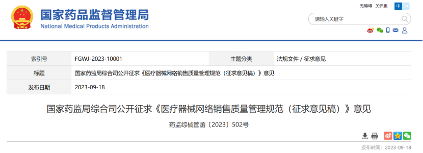9月18日,国家药监局发布《国家药监局综合司公开征求<医疗器械网络销售质量管理规范(征求意见稿)>意见》(原文附文末),2023年9月15日—10月14日向社会公开征求意见。