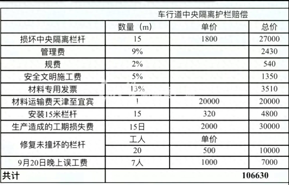 根据这名发帖网友所附的赔偿明细表显示,损坏中央隔离栏杆价格为每米1800元,15米总价27000元,还包括材料运输费20000元、工期损失费30000元及20名工人的施工费10000元等各10项费用,共计106630元。