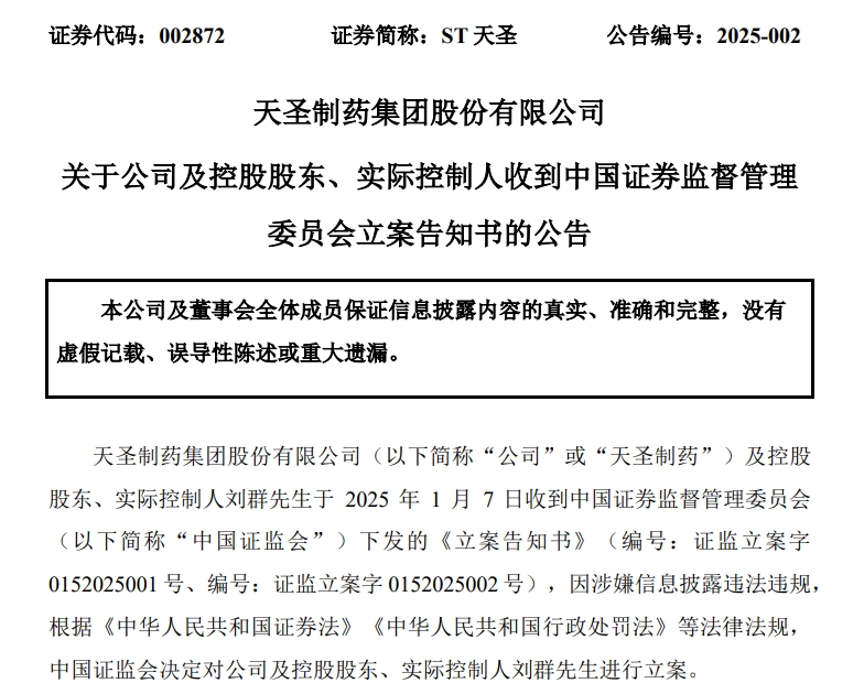 1月8日晚间,ST天圣发布公告称,公司及控股股东、实际控制人刘群于2025年1月7日收到中国证监会下发的《立案告知书》,因涉嫌信息披露违法违规,根据《中华人民共和国证券法》《中华人民共和国行政处罚法》等法律法规,中国证监会决定对公司及控股股东、实际控制人刘群进行立案。
