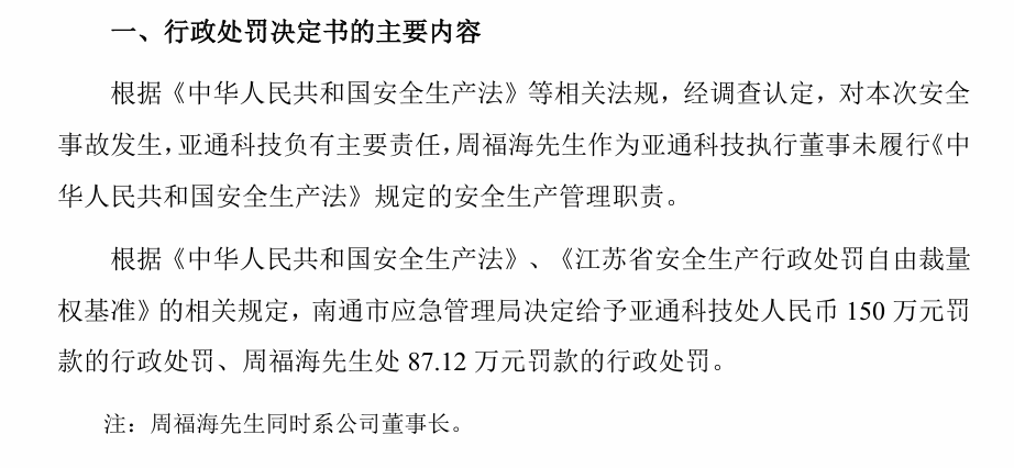 经调查认定,南通市应急管理局决定,对亚通科技处罚款150万元,对亚太科技董事长周福海(兼亚通科技执行董事)处罚款87.12万元。