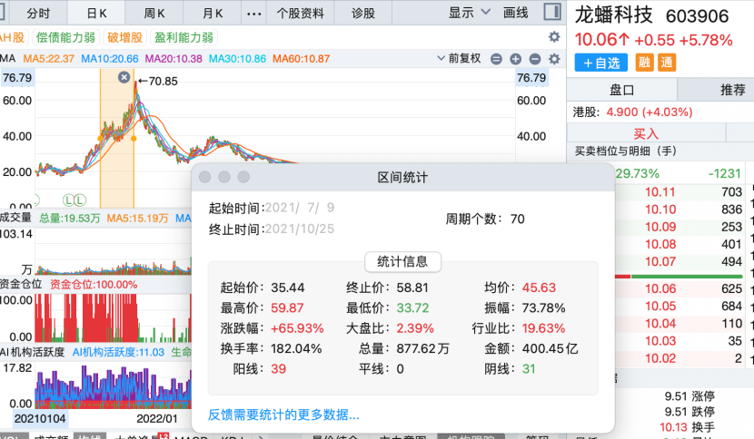 而在贺雪琴夫妇内幕交易“龙蟠科技”期间,后者股价逐渐上涨,同花顺数据显示,2021年7月9日至10月25日期间,龙蟠科技股价从35.44元/股涨至59.87元/股(前复权),涨幅65.93%,并在此后的10月29日涨至历史最高点70.85元/股。