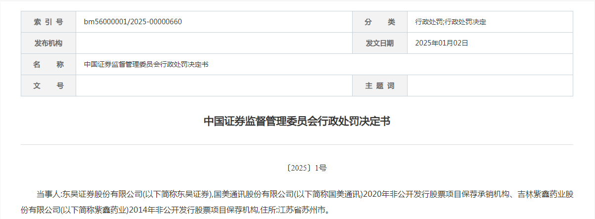 1月2日,证监会披露2025年1号行政处罚决定书,因在国美通讯2020年非公开发行股票项目保荐项目、紫鑫药业2014年非公开发行股票项目保荐项目中未勤勉尽责,东吴证券及投行相关责任人合计被罚没1506.44万元。