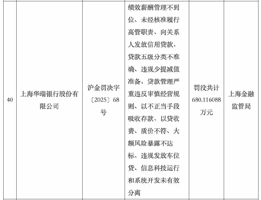 罚单显示,上海华瑞银行股份有限公司因绩效薪酬管理不到位、未经核准履行高管职责、向关系人发放信用贷款、贷款五级分类不准确、违规少提减值准备、贷款管理严重违反审慎经营规则、以不正当手段吸收存款、以贷收费、质价不符、大额风险暴露不达标、违规发放车位贷、信息科技运行和系统开发未有效分离,被罚没合计680万元。