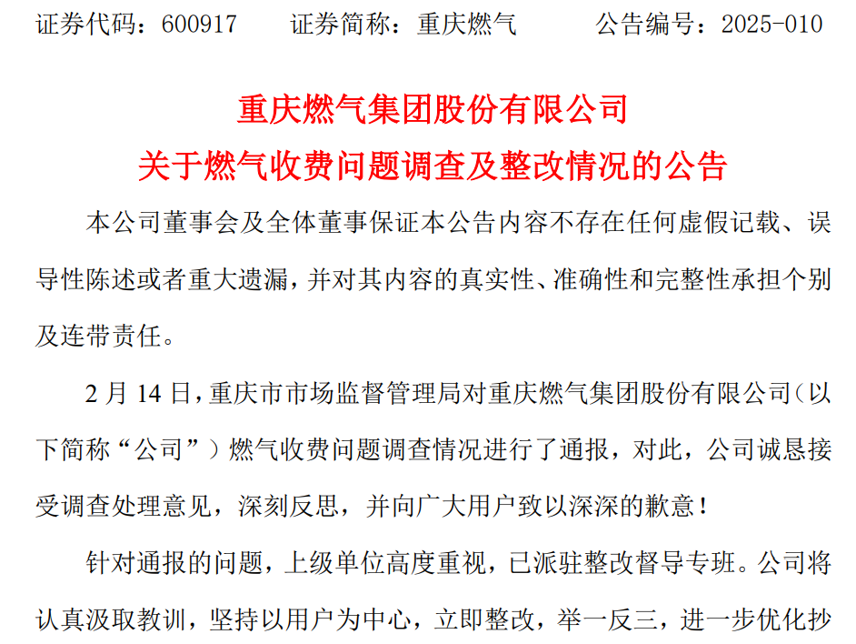 重庆燃气在2月14日晚间的公告中称,重庆市市场监督管理局对公司燃气收费问题调查情况进行了通报,对此,公司诚恳接受调查处理意见,深刻反思,并向广大用户致以深深的歉意!针对通报的问题,上级单位高度重视,已派驻整改督导专班。公司将认真汲取教训,坚持以用户为中心,立即整改,举一反三,进一步优化抄表流程,充实服务力量,完善抄收管理;进一步加快智能化升级,提高抄表精准度;实施网格化服务,加强与用户的沟通,持续提升服务质量和水平;尽快全面完成整改工作,切实维护广大用户的权益。同时,对相关责任人和责任部门进行严肃追责问责。