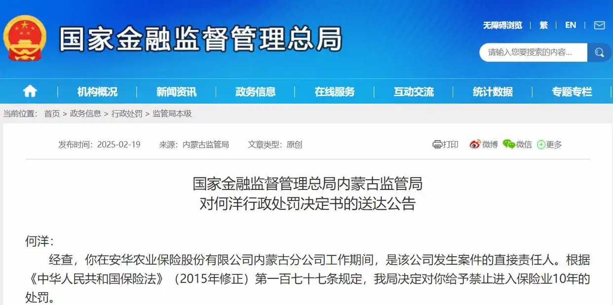 2月19日,国家金融监督管理总局内蒙古监管局发布了对何洋行政处罚决定书的送达公告,公告称,何洋在安华农业保险股份有限公司内蒙古分公司工作期间,是该公司发生案件的直接责任人。根据《中华人民共和国保险法》(2015年修正)第一百七十七条规定,我局决定对你给予禁止进入保险业10年的处罚。