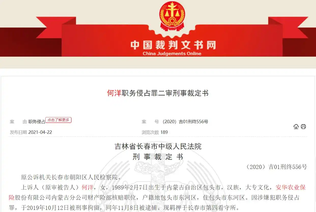 根据中国裁判文书网的裁定书,何洋(女),1989年2月7日出生于内蒙古自治区包头市,安华农业保险内蒙古分公司财产险部核赔职位,因涉嫌犯职务侵占罪,于2019年10月12日被刑事拘留,同年11月8日被逮捕。
