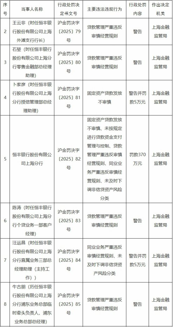 国家金融监督管理总局上海监管局昨日公布的行政处罚信息公开表(沪金罚决字〔2025〕79-85号)显示,恒丰银行股份有限公司上海分行固定资产贷款发放不审慎、未按规定进行贷款资金支付管理与控制、贷款管理严重违反审慎经营规则、同业业务严重违反审慎经营规则、未及时下调非信贷资产风险分类。上海金融监管局对其罚款370万元。