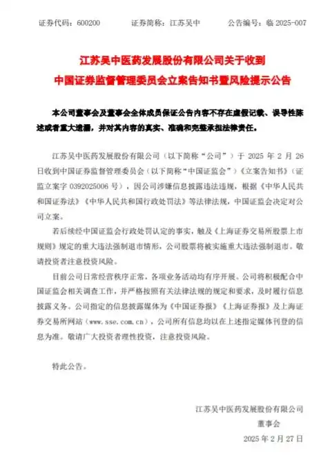 2月26日,江苏吴中医药发展股份有限公司(江苏吴中,600200.SH)公告,公司于 2025 年 2 月 26日收到中国证券监督管理委员会《立案告知书》,因公司涉嫌信息披露违法违规,中国证监会决定对公司立案。