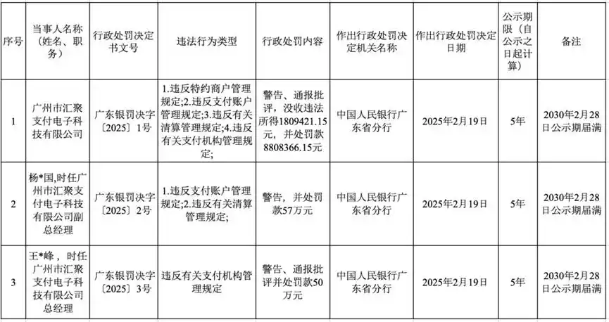 中国人民银行公告显示,广州市汇聚支付电子科技有限公司(下称“汇聚支付”)因存在多项违规行为,被合计罚没1061万元,公司总经理、副总经理同时被处以50万元、57万元的个人罚款。