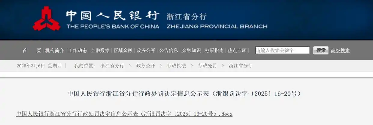 2025年3月5日,中国人民银行浙江省分行对浙江永嘉农村商业银行股份有限公司(以下简称“永嘉农商行”)开出行政处罚罚单,罚款金额达297.5万元,相关责任人同时受到警告及经济处罚。根据浙银罚决字〔2025〕16-20号公示表,该行涉及支付结算、反假货币、信用信息管理、未按规定报送信息、客户身份识别等六类违规行为,监管处罚公示期限为五年。