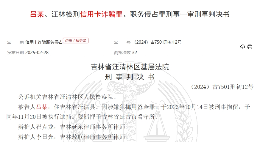日前,吉林省汪清林区基层法院对一起银行职员职务侵占案件作出判决,被告人吕某因利用职务之便侵占客户理财资金,被依法判处有期徒刑五年六个月,并处罚金人民币十万元。