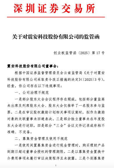 深交所要求震安科技董事会充分重视上述问题,吸取教训,及时整改,杜绝问题再次发生。