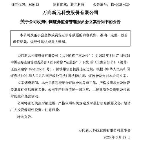 万向新元科技股份有限公司因信披违规遭证监会立案调查