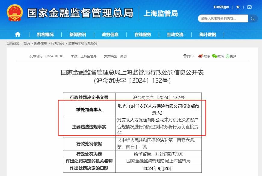 同时,时任安联人寿保险有限公司投资部负责人张光,因对相关违规行为负直接责任,被给予警告,并处罚款7万元。