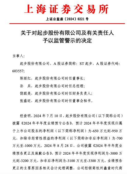 10月11日,上海证券交易所下发关于对起步股份有限公司(以下简称“ST起步”或“公司”)及有关责任人予以监管警示的决定。上交所称,因公司2024年半年度业绩预告披露不准确,实际净利润、扣非后净利润与预告金额差异幅较大,影响投资者合理预期,公司迟至2024年8月28日才发布业绩预告更正公告,更正公告披露不及时,决定对ST起步及时任董事长陈丽红、时任总经理孙兵、时任财务负责人饶聪美、时任董事会秘书张盛旺予以监管警示。
